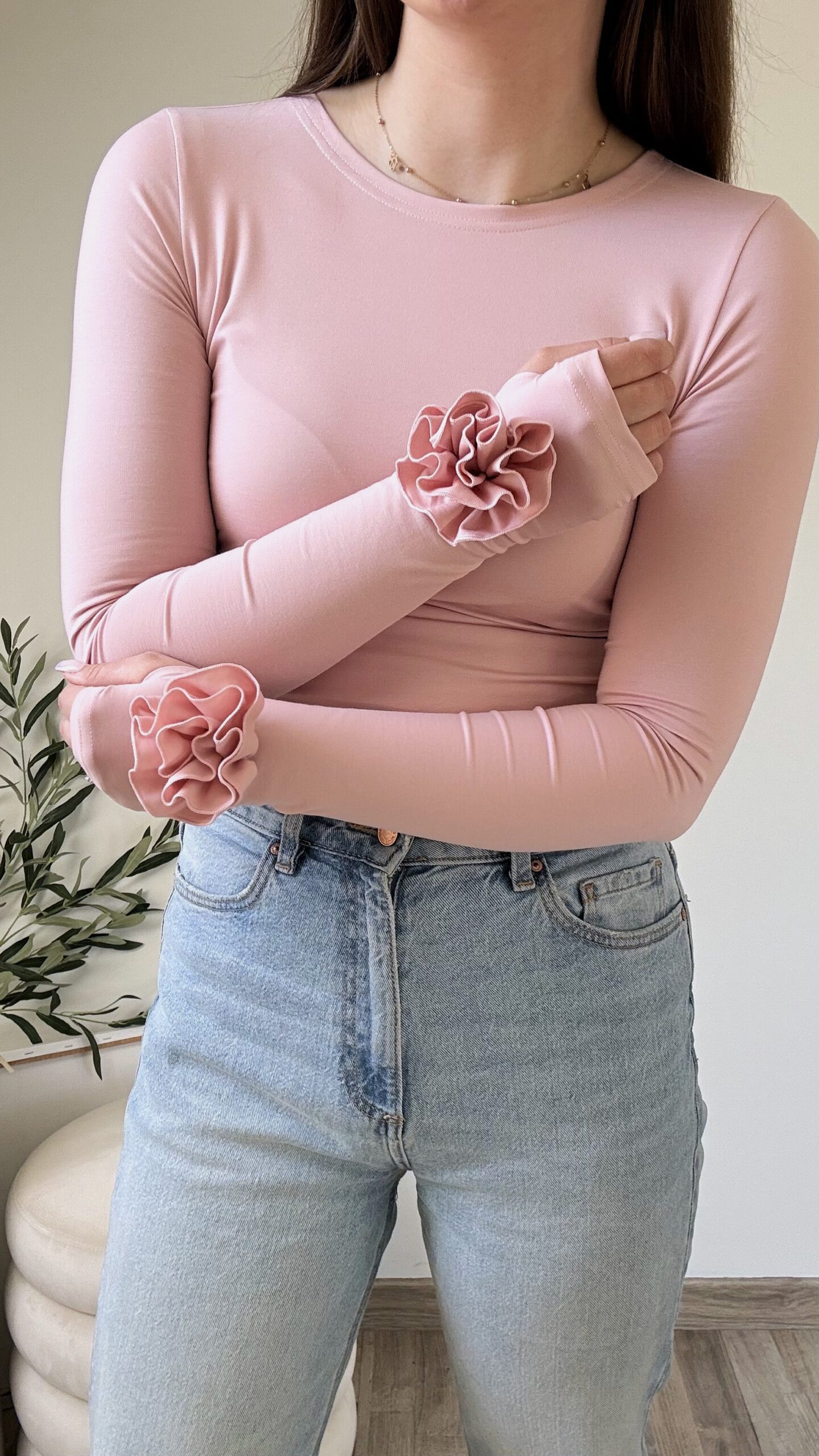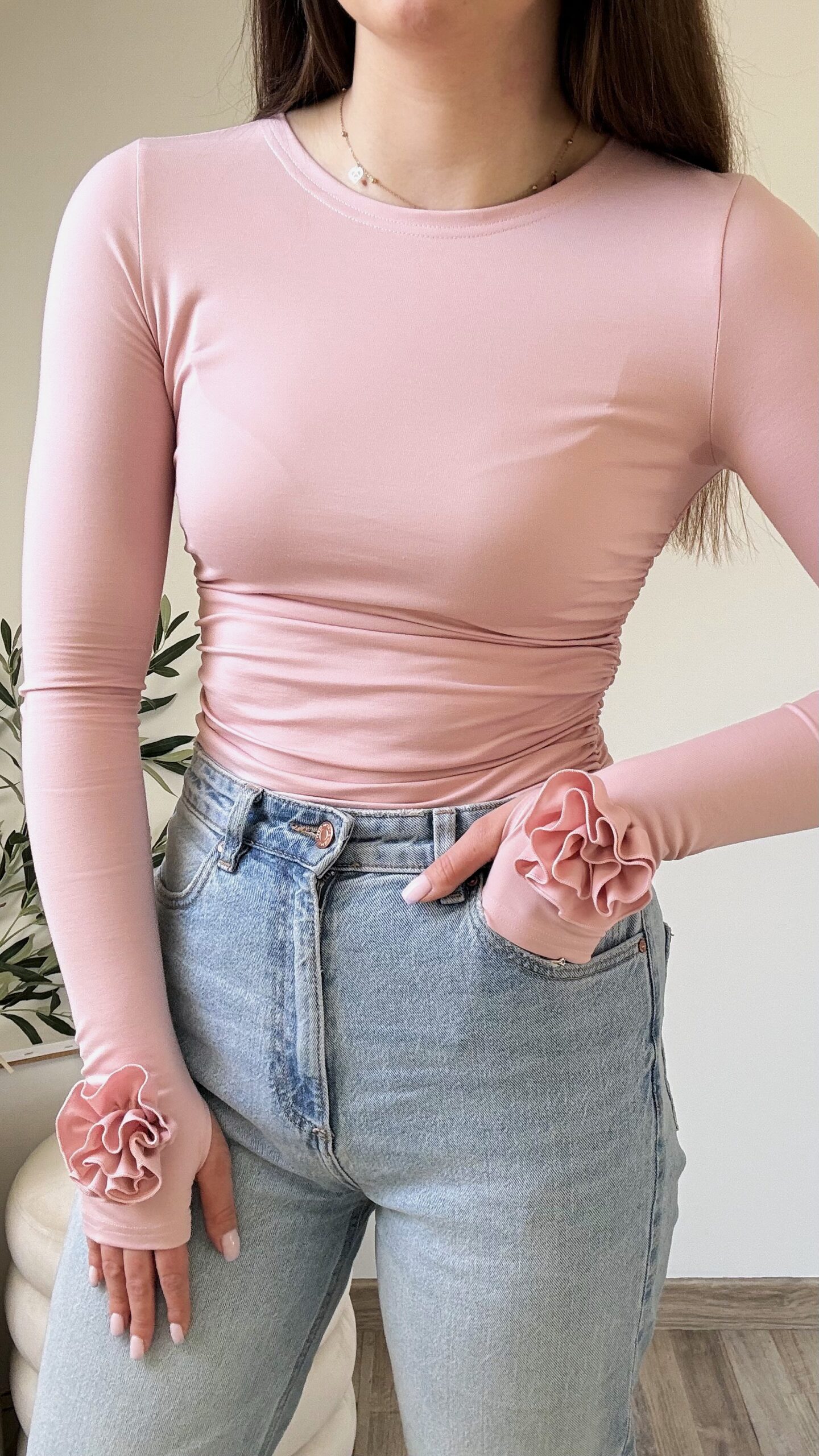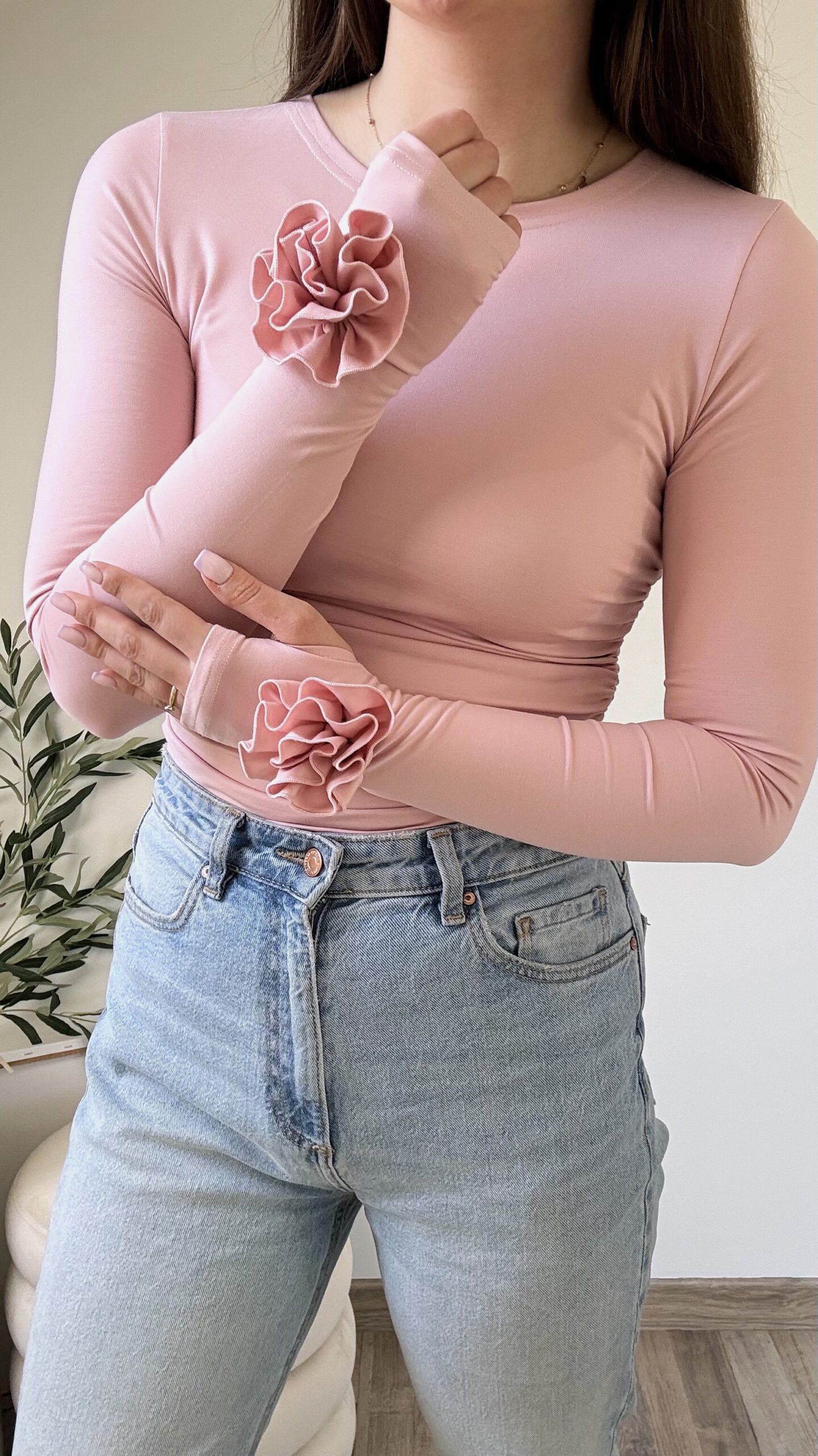 Bluzka ROSE z motywem róż na rękawach to elegancki i stylowy model. Posiada wycięcie na kciuk, co dodaje jej sportowego charakteru, a delikatne marszczenia po bokach podkreślają talię i nadają sylwetce kobiecego kształtu. Pasuje zarówno do codziennych jak i eleganckich stylizacji. Polska produkcja – jakość TOP! Wybierz swój kolor i ciesz się wyjątkowym lookiem na jesień!